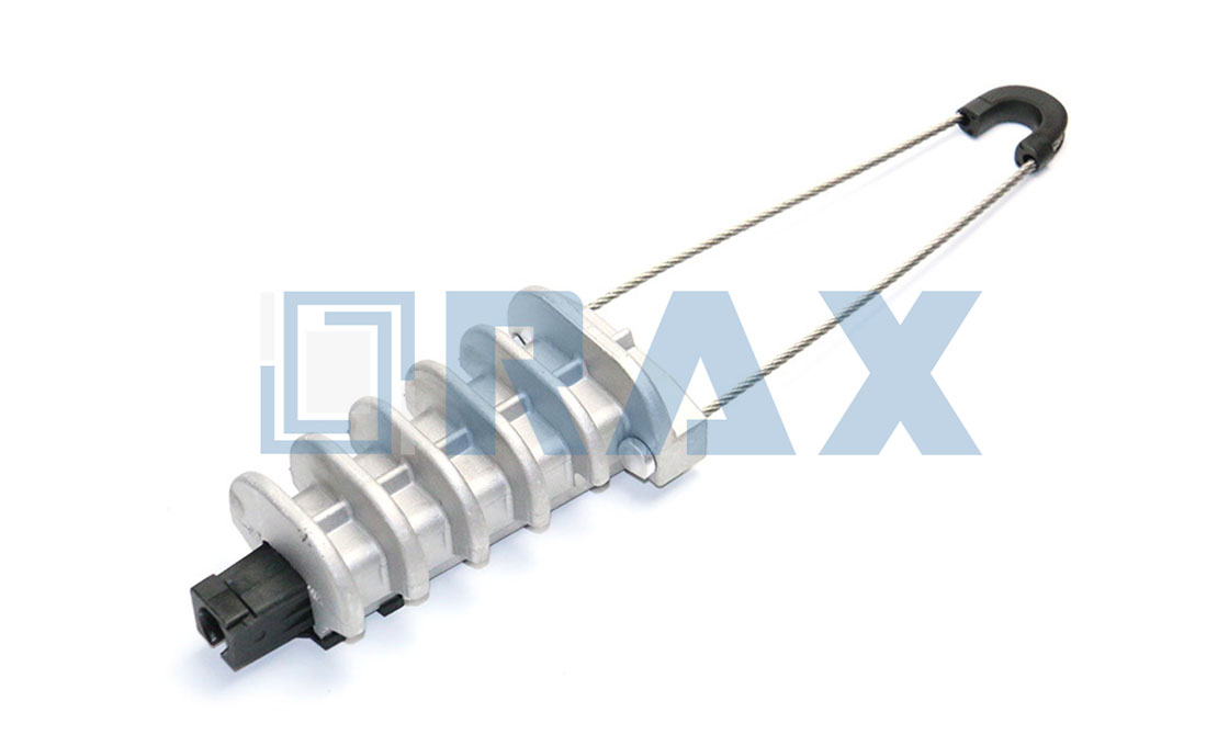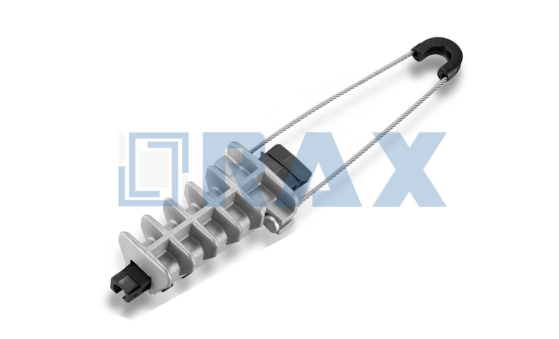 An anchoring clamp, also known as a wedge type tension clamp, is a device used to secure and anchor a conductor or cable to overhead wires, telecommunication lines, or other utility infrastructure. RaxPower anchoring clamps consist of a body, wedges, and a bail, designed to firmly hold cables and prevent movement due to tension, wind, or environmental factors.